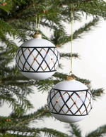 2 szklane bombki choinkowe z ornamentową dekoracją w białym kolorze