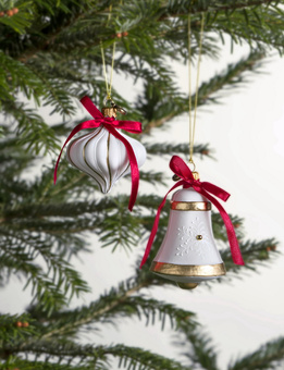 2 szklane bombki choinkowe ze złotymi akcentami - dzwonek i bączek
